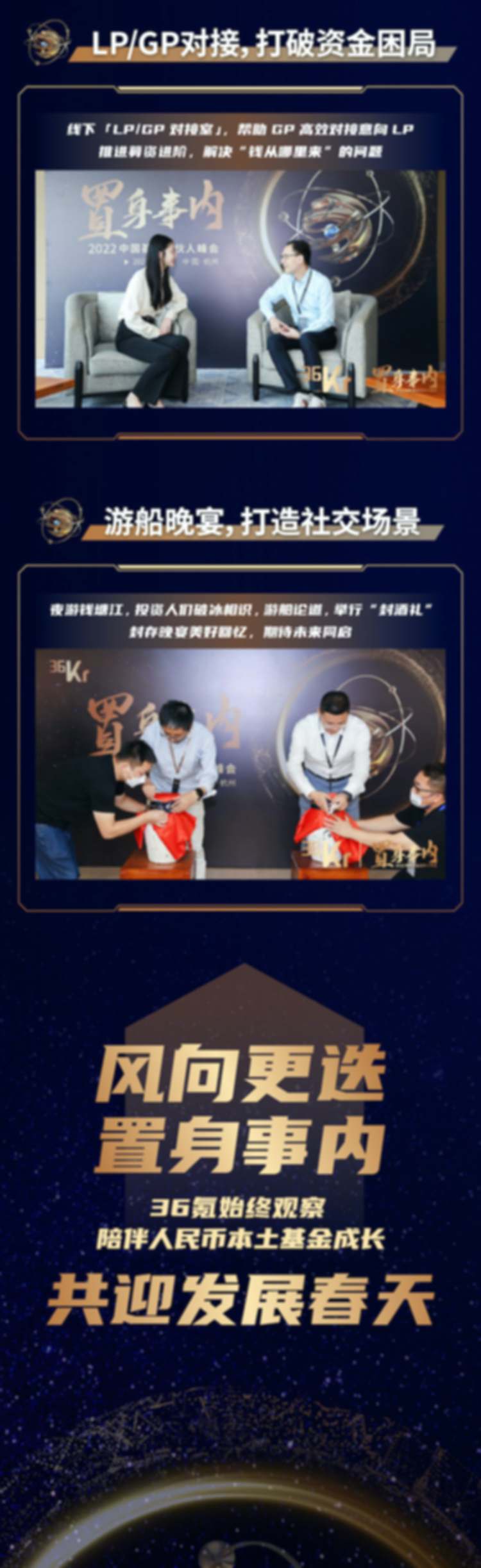 中国基金合伙人峰会是36氪主办的面向LP和投资机构的行业峰会,云集了母基金、政府引导基金、银行资本、险资、上市公司、家族办公室高净值LP与GP齐聚一堂,共同探讨新经济时代下中国创投行业科学扭转现实、资本撬动未来的无限可能……