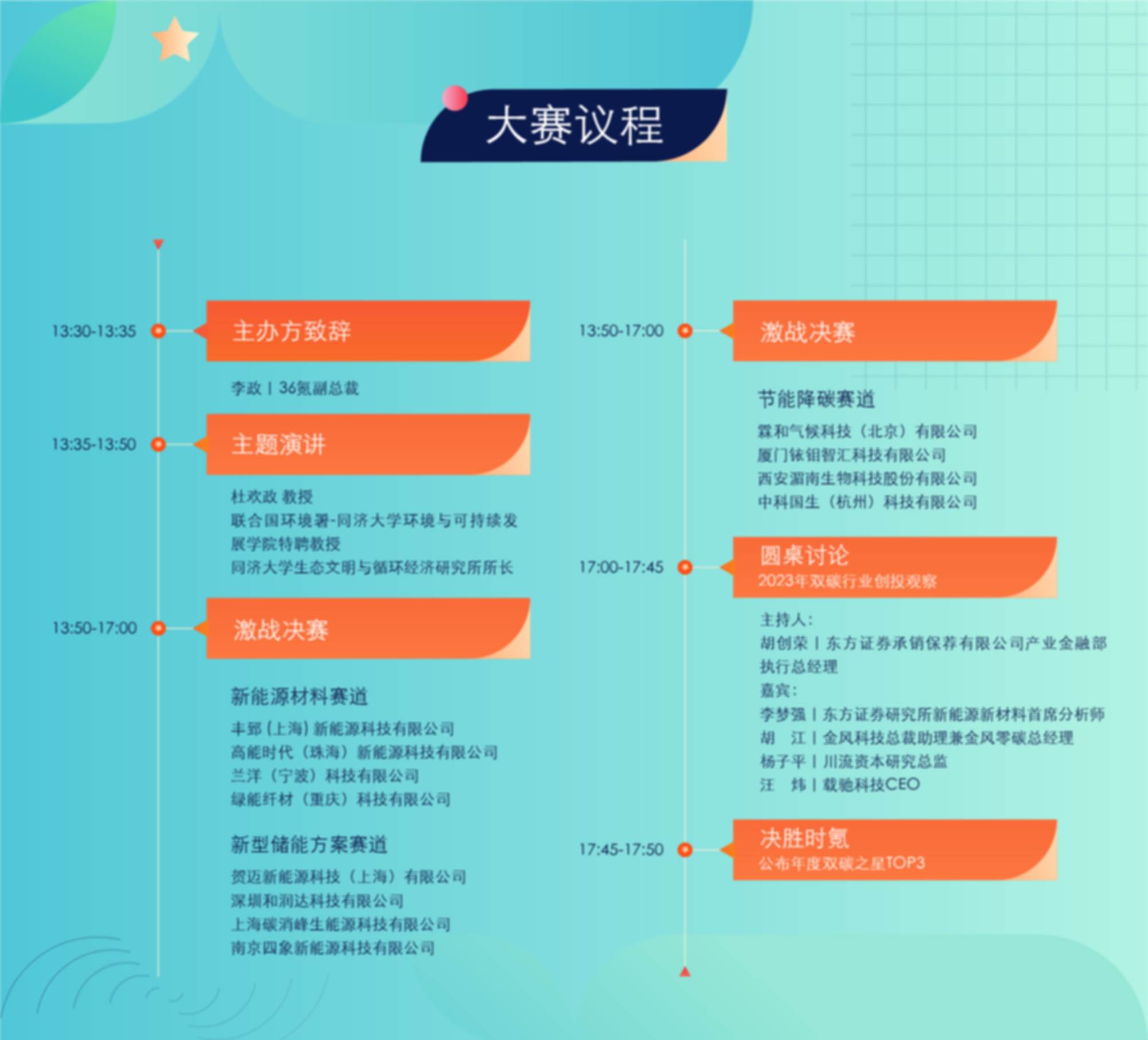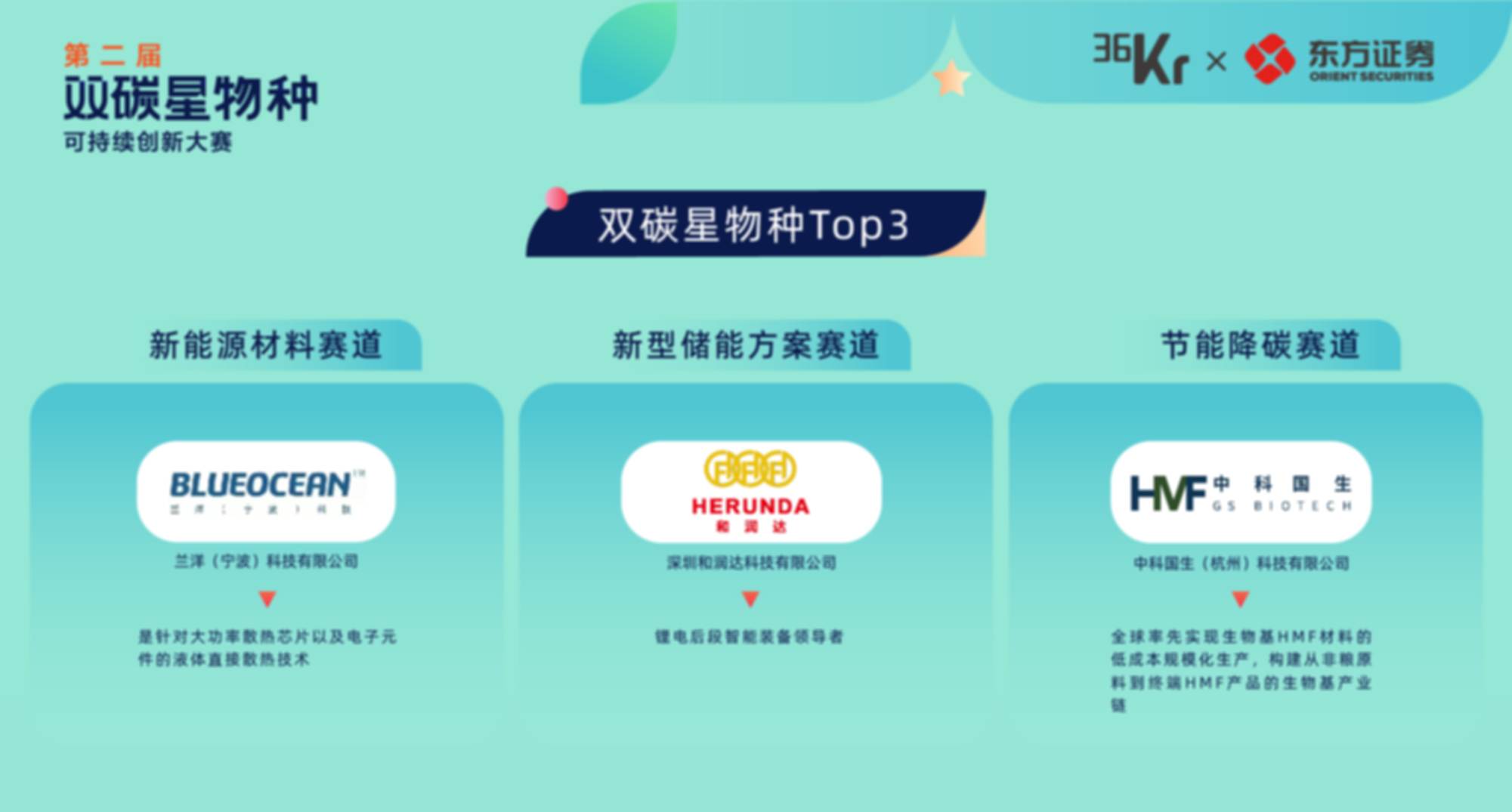 在此背景下,36氪联合东方证券举办第二届双碳星物种 · 可持续创新大赛,本届大赛聚焦供给侧(新能源材料、新型储能方案)、应用侧(节能减碳)两大方向三大领域,本次大赛共计招募到165个优质项目,经过评审们精心筛选,最终有30余个项目脱颖而出进入复赛,12个项目进入决赛,最终评选出分数最高的Top3双碳「星」公司 。